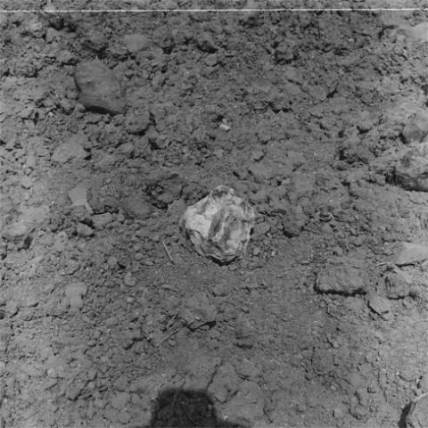 Sur les terrasses à l'ouest du site, nous avons remarqué la présence de ce gros nucléus de quartzite en surface.